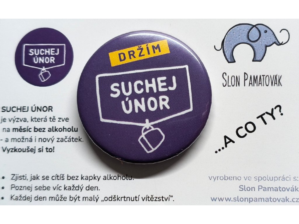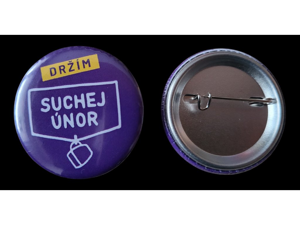 Magnetka nebo placka (odznáček) o průměru 37 mm "DRŽÍM SUCHÁČ" nebo "DRŽÍM SUCHEJ ÚNOR" - dárek ke každé objednávce nad 100 Kč k příležitosti československé osvětové kampaně SUCHEJ ÚNOR.